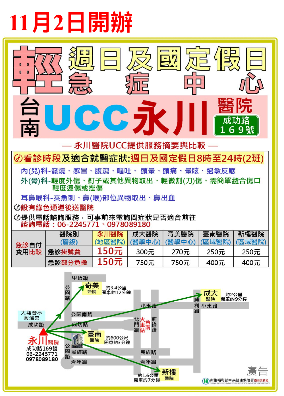 〔轉知〕台南市週日及國定假日輕急症中心(UCC)試辦醫院:永川醫院11/2開辦